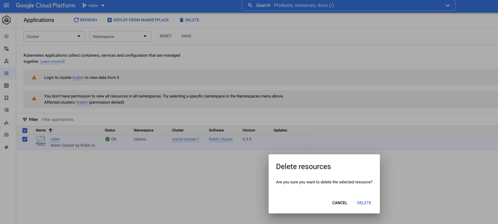 In order to uninstall Robin CNS from a GKE Kubernetes cluster via the Google Cloud Platform UI navigate to the Application details page, select the instance of Robin CNS to be deleted, and click the delete action at the top of the screen. You should see a screen similar to the one below.